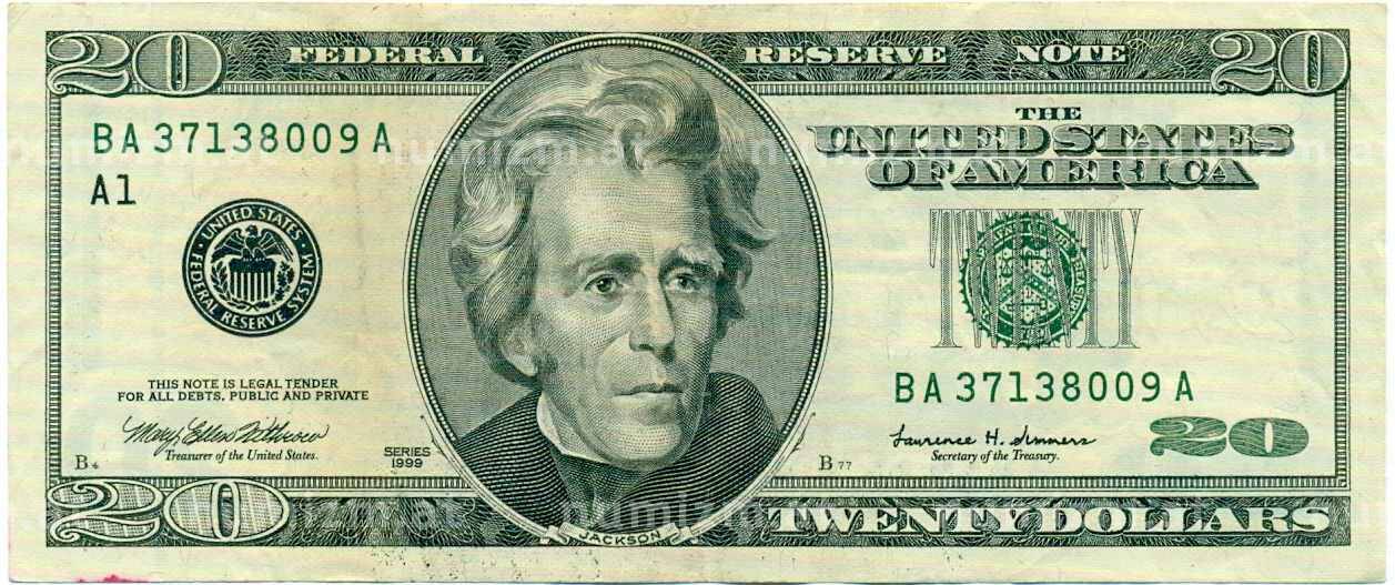 Банкнота 20 долларов 1999 года США (Артикул: K10-0316): подробные характеристики, качественные фотографии в высоком разрешении, низкая цена.