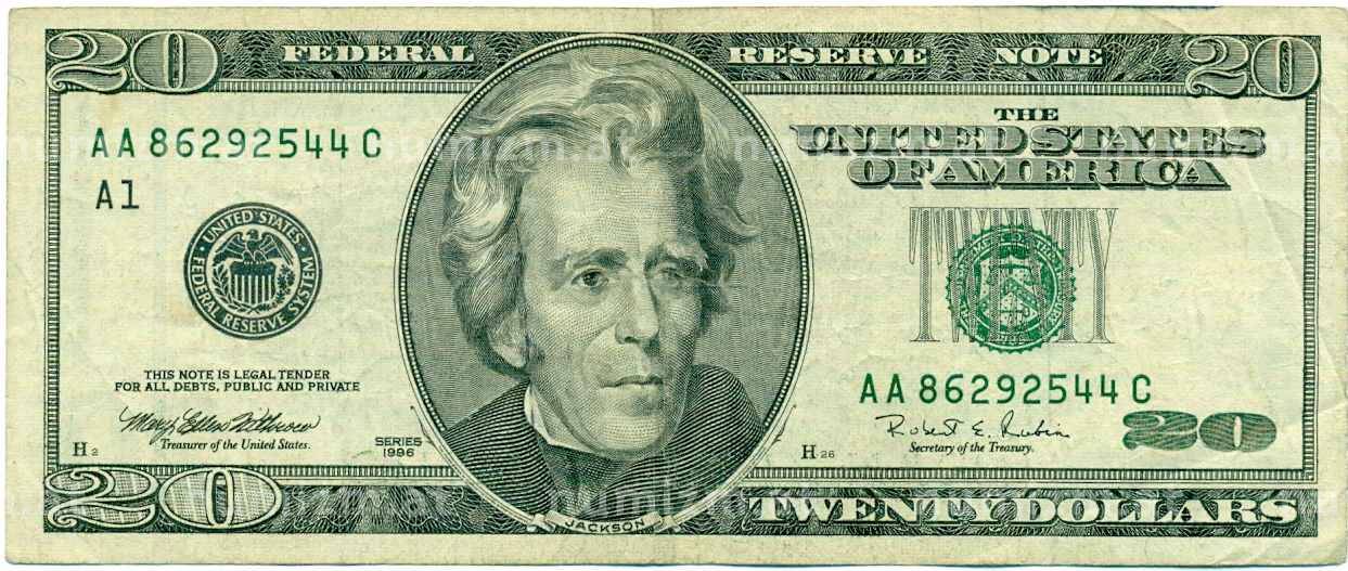 • Банкнота 20 долларов 1996 года США (Артикул: K10-0355) — Фото №1 Банкнота 20 долларов 1996 года США (Артикул: K10-0355) — Фото №2