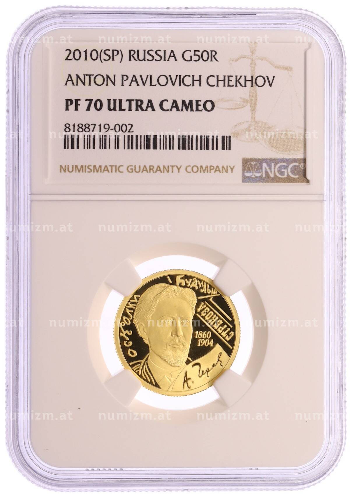 Купить 50 рублей 2010 года СПМД «150 лет со дня рождения Антона Павловича Чехова» в слабе NGC (PF70 ULTRA CAMEO) по привлекательной цене можно в нашем интернет-магазине — Вам достаточно оформить заказ на сайте. Все монеты, представленные в каталоге, находятся в наличии на нашем складе.