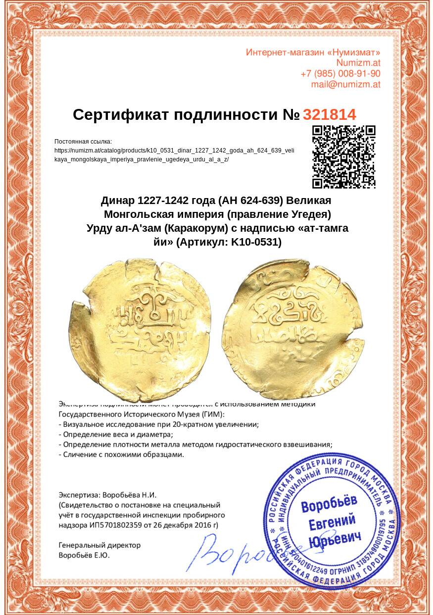 Купить Динар 1227-1242 года (AH 624-639) Великая Монгольская империя (правление Угедея) Урду ал-А'зам (Каракорум) с надписью «ат-тамга йи» по привлекательной цене можно в нашем интернет-магазине — Вам достаточно оформить заказ на сайте. Все монеты, представленные в каталоге, находятся в наличии на нашем складе.