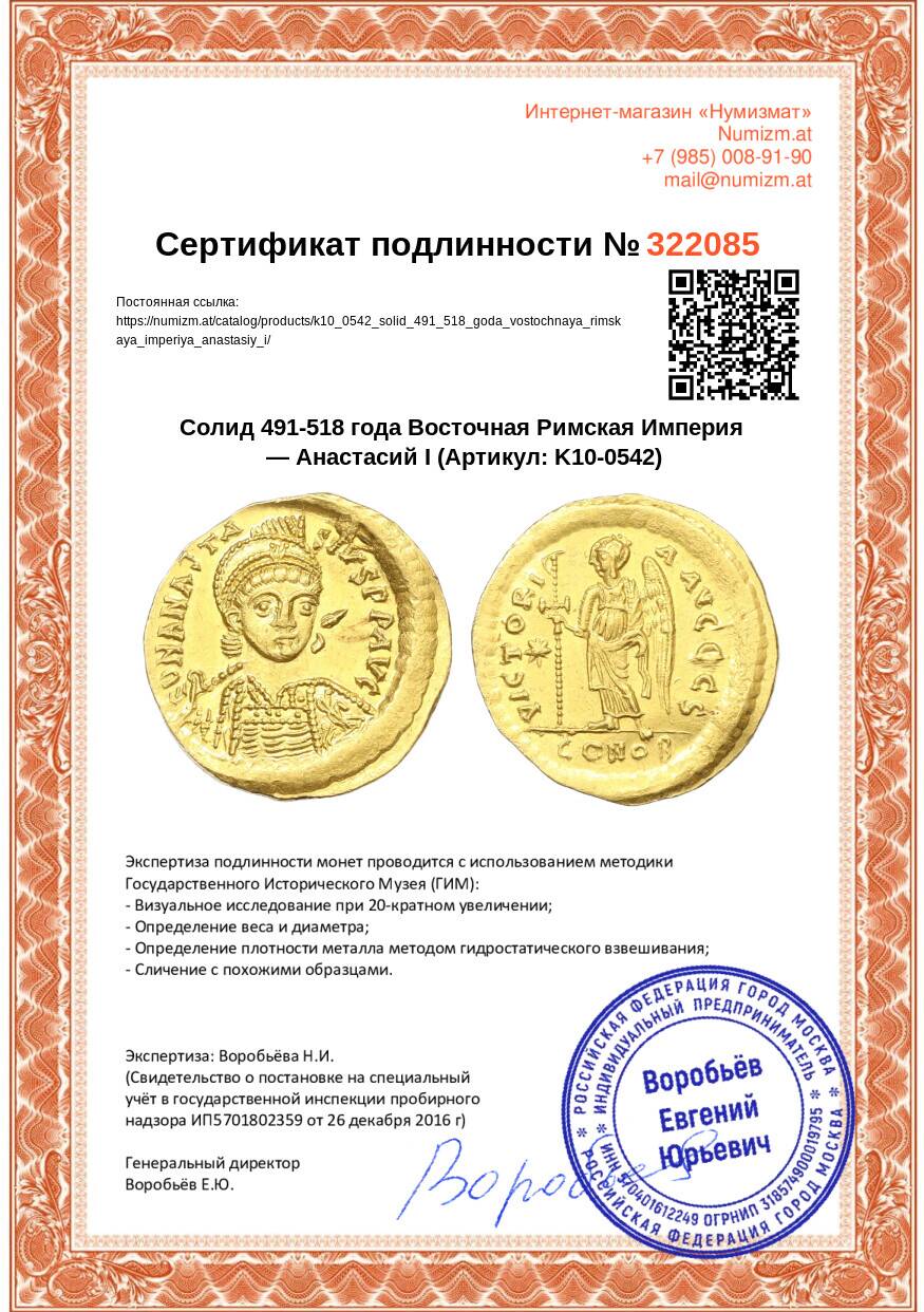 Купить Солид 491-518 года Восточная Римская Империя — Анастасий I по привлекательной цене можно в нашем интернет-магазине — Вам достаточно оформить заказ на сайте. Все монеты, представленные в каталоге, находятся в наличии на нашем складе.
