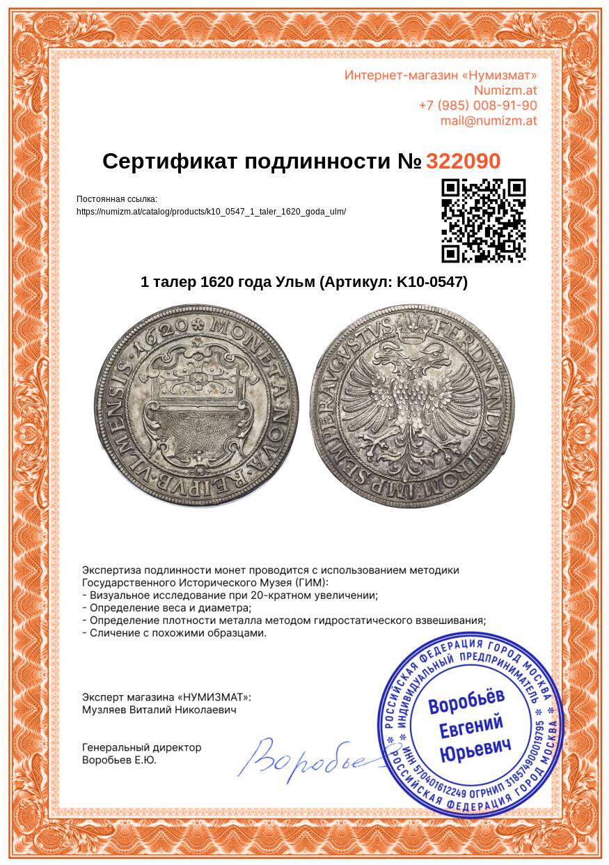 20.01.2025Интернет магазин «Нумизмат» предлагает приобрести 1 талер 1620 года Ульм.