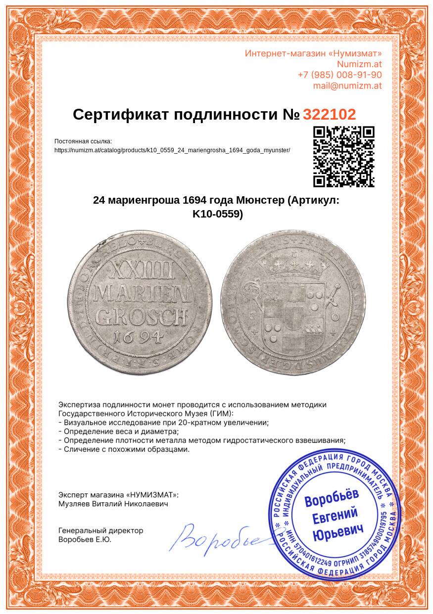 20.01.2025Интернет магазин «Нумизмат» предлагает приобрести 24 мариенгроша 1694 года Мюнстер.