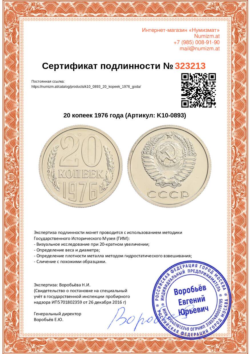 Монета 20 копеек 1976 года (Артикул: K10-0893): подробные характеристики, качественные фотографии в высоком разрешении, низкая цена.