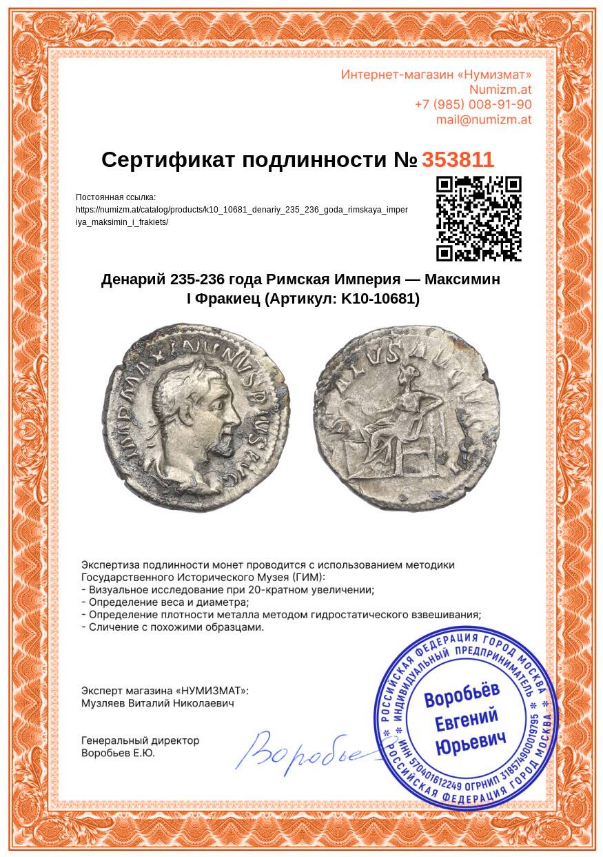 Купить Денарий 235-236 года Римская Империя — Максимин I Фракиец по привлекательной цене можно в нашем интернет-магазине — Вам достаточно оформить заказ на сайте. Все монеты, представленные в каталоге, находятся в наличии на нашем складе.