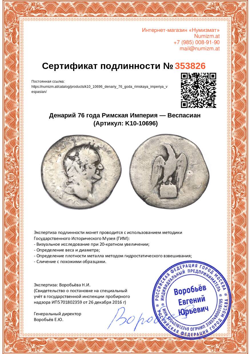 Купить Денарий 76 года Римская Империя — Веспасиан по привлекательной цене можно в нашем интернет-магазине — Вам достаточно оформить заказ на сайте. Все монеты, представленные в каталоге, находятся в наличии на нашем складе.