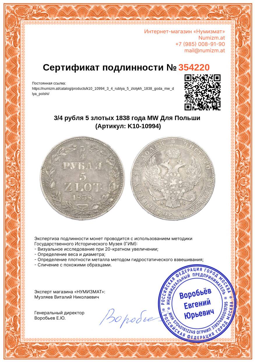 20.01.2025Интернет магазин «Нумизмат» предлагает приобрести 3/4 рубля 5 злотых 1838 года МW Для Польши.
