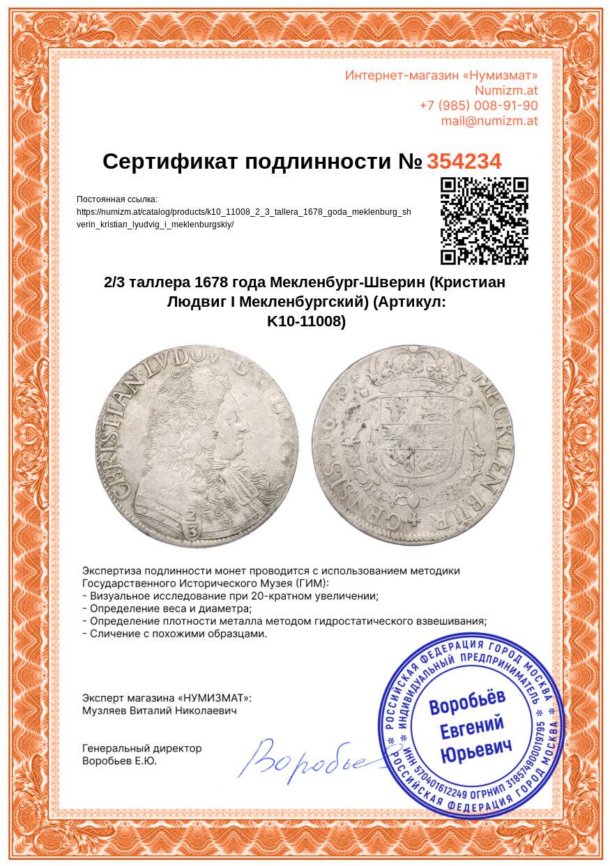 20.01.2025Интернет магазин «Нумизмат» предлагает приобрести 2/3 таллера 1678 года Мекленбург-Шверин (Кристиан Людвиг I Мекленбургский).