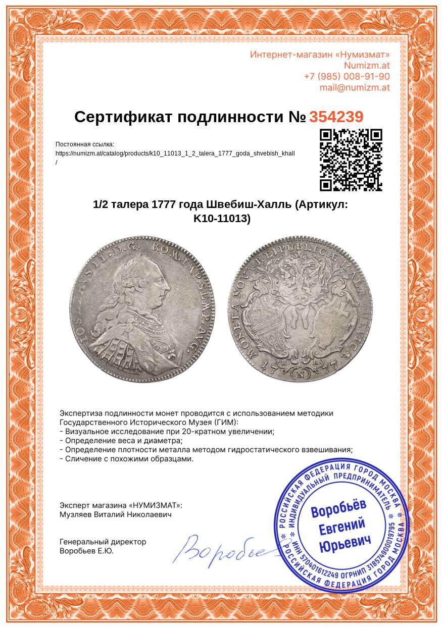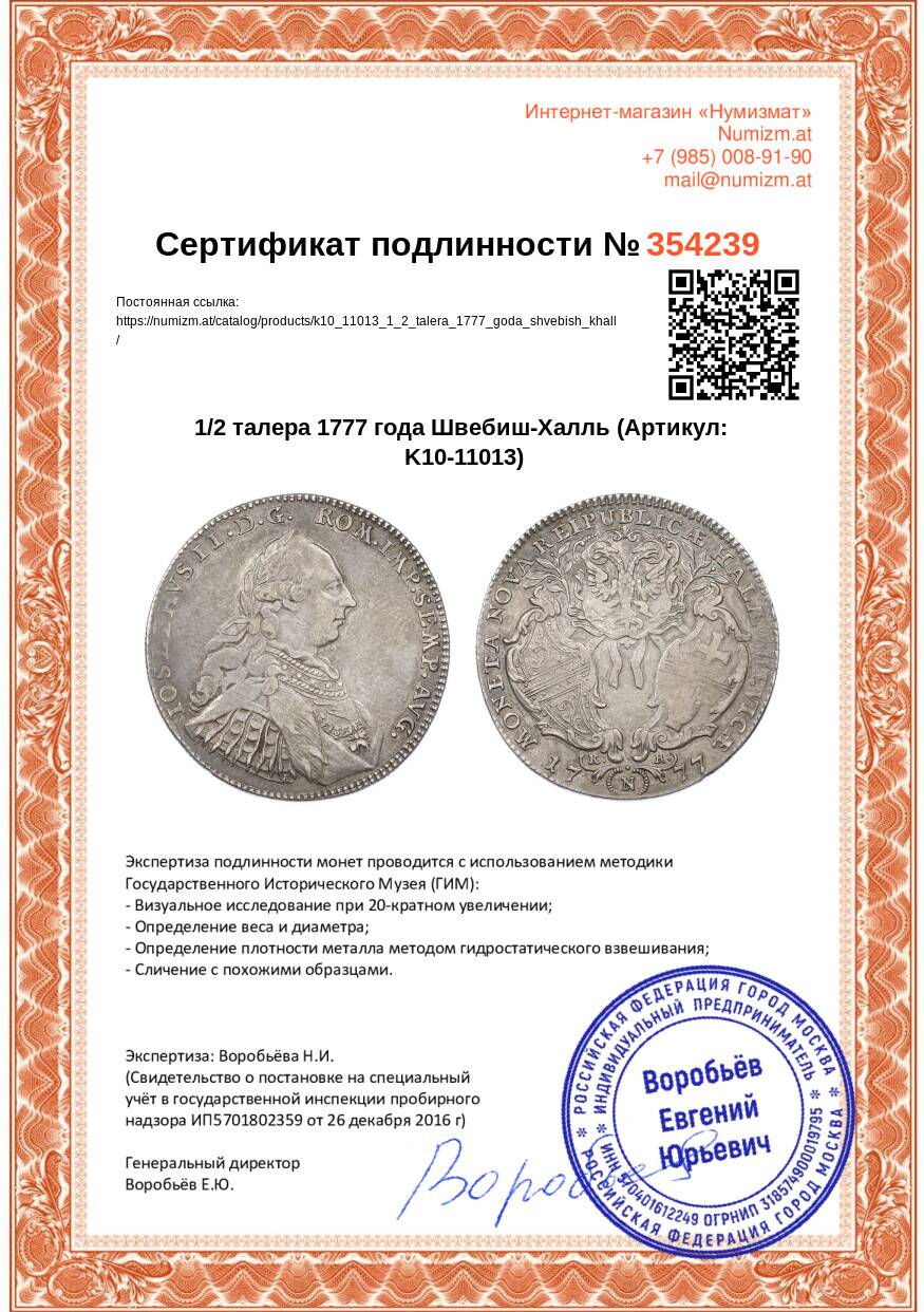 20.01.2025Интернет магазин «Нумизмат» предлагает приобрести 1/2 талера 1777 года Швебиш-Халль.