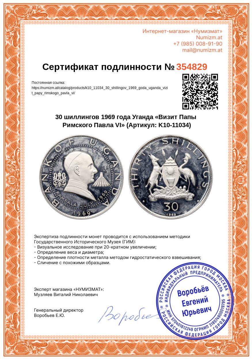 20.01.2025Интернет магазин «Нумизмат» предлагает приобрести 30 шиллингов 1969 года Уганда «Визит Папы Римского Павла VI».
