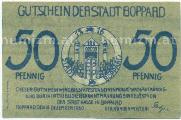 Банкнота 50 пфеннигов 1920 года Германия — Боппард (Нотгельд) (Артикул: K10-11352): подробные характеристики, качественные фотографии в высоком разрешении, низкая цена.