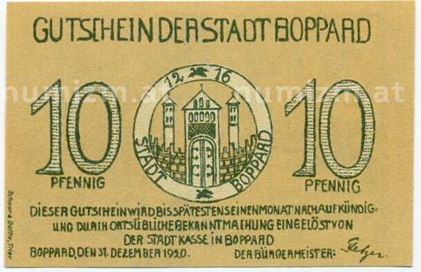 Банкнота 10 пфеннигов 1920 года Германия — Боппард (Нотгельд) (Артикул: K10-11355): подробные характеристики, качественные фотографии в высоком разрешении, низкая цена.