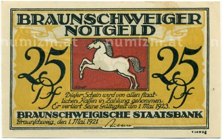 Банкнота 25 пфеннигов 1921 года Германия — Брауншвейг (Нотгельд) (Артикул: K10-11384): подробные характеристики, качественные фотографии в высоком разрешении, низкая цена.