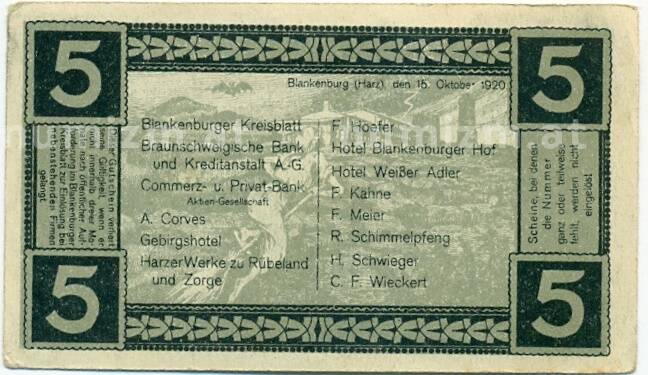 Банкнота 5 пфеннигов 1920 года Германия — Бланкенбург (Нотгельд) (Артикул: K10-11395): подробные характеристики, качественные фотографии в высоком разрешении, низкая цена.