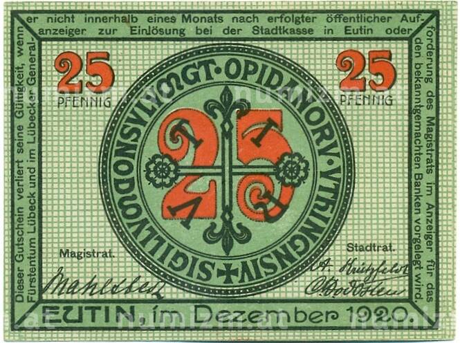 20.01.2025Интернет магазин «Нумизмат» предлагает приобрести 25 пфеннигов 1921 года Германия — Ойтин (Нотгельд).
