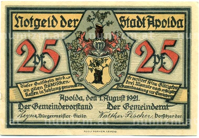 Банкнота 25 пфеннигов 1921 года Германия — Апольда (Нотгельд) (Артикул: K10-11506): подробные характеристики, качественные фотографии в высоком разрешении, низкая цена.