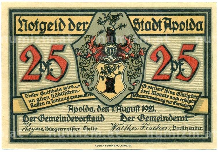 Купить 25 пфеннигов 1921 года Германия — Апольда (Нотгельд) по привлекательной цене можно в нашем интернет-магазине — Вам достаточно оформить заказ на сайте. Все монеты, представленные в каталоге, находятся в наличии на нашем складе.