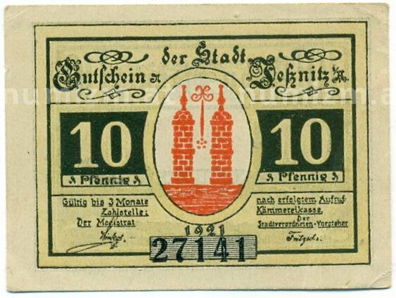 Купить 10 пфеннигов 1921 года Германия — Есниц (Нотгельд) по привлекательной цене можно в нашем интернет-магазине — Вам достаточно оформить заказ на сайте. Все монеты, представленные в каталоге, находятся в наличии на нашем складе.