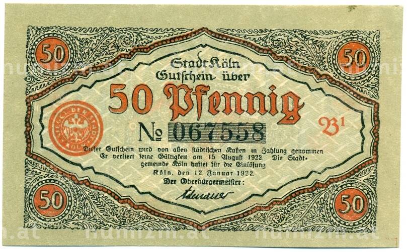 Интернет магазин «Нумизмат» предлагает приобрести 50 пфеннигов 1922 года Германия — Кельн (Нотгельд).