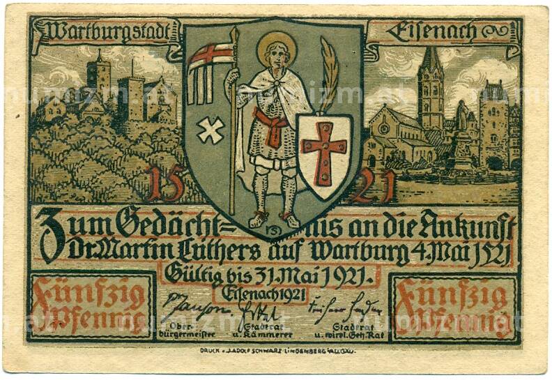 Банкнота 50 пфеннигов 1921 года Германия — город Эйзенах (Нотгельд) (Артикул: K10-11780): подробные характеристики, качественные фотографии в высоком разрешении, низкая цена.