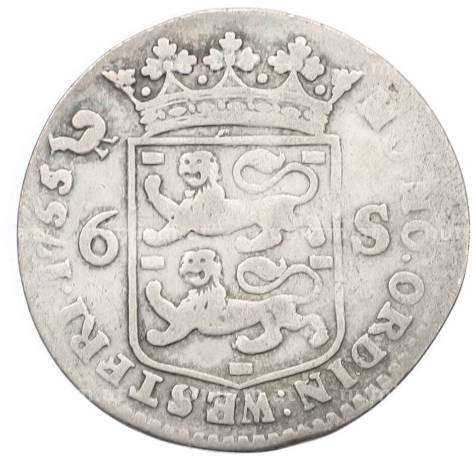 Купить 6 стюверов 1755 года Голландская республика — провинция Западная Фрисландия по привлекательной цене можно в нашем интернет-магазине — Вам достаточно оформить заказ на сайте. Все монеты, представленные в каталоге, находятся в наличии на нашем складе.