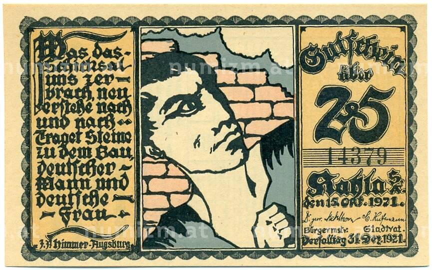Интернет магазин «Нумизмат» предлагает приобрести 25 пфеннигов 1921 года Германия — Кала (Нотгельд).