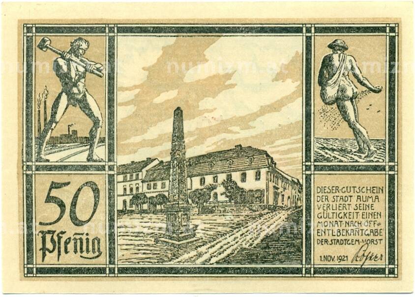 Банкнота 50 пфеннигов 1921 года Германия — Аума (Нотгельд) (Артикул: K10-11866): подробные характеристики, качественные фотографии в высоком разрешении, низкая цена.
