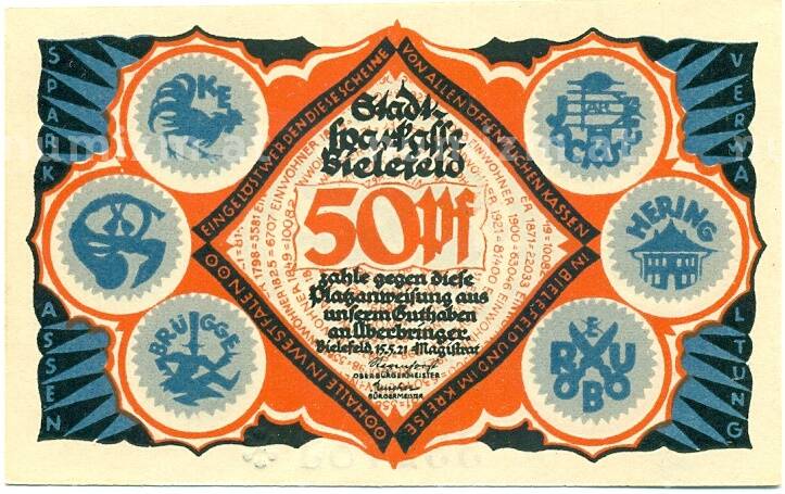 • Банкнота 50 пфеннигов 1921 года Германия — Билефельд (Нотгельд) (Артикул: K10-11876) — Фото №1 Банкнота 50 пфеннигов 1921 года Германия — Билефельд (Нотгельд) (Артикул: K10-11876) — Фото №2