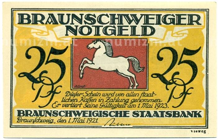 Банкнота 25 пфеннигов 1921 года Германия — Брауншвейг (Нотгельд) (Артикул: K10-11881): подробные характеристики, качественные фотографии в высоком разрешении, низкая цена.