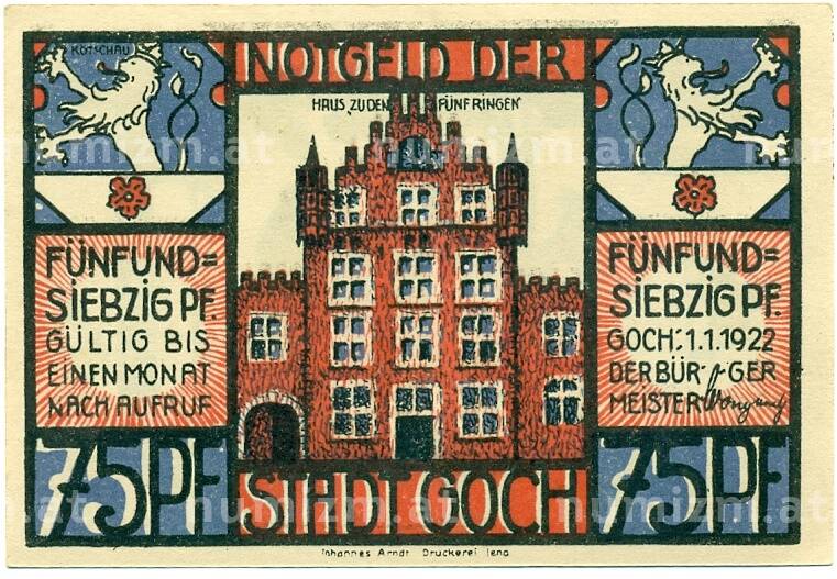 Купить 75 пфеннигов 1922 года Германия — Гох (Нотгельд) по привлекательной цене можно в нашем интернет-магазине — Вам достаточно оформить заказ на сайте. Все монеты, представленные в каталоге, находятся в наличии на нашем складе.