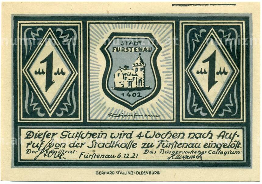 Купить 1 марка 1921 года Германия — Фюрстенау (Нотгельд) по привлекательной цене можно в нашем интернет-магазине — Вам достаточно оформить заказ на сайте. Все монеты, представленные в каталоге, находятся в наличии на нашем складе.