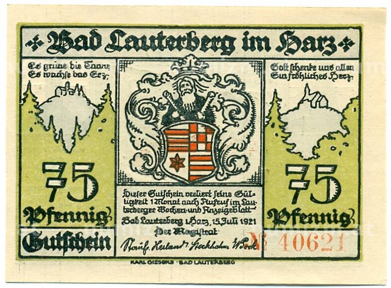 Купить 75 пфеннигов 1921 года Германия — Бад-Лаутерберг (Нотгельд) по привлекательной цене можно в нашем интернет-магазине — Вам достаточно оформить заказ на сайте. Все монеты, представленные в каталоге, находятся в наличии на нашем складе.