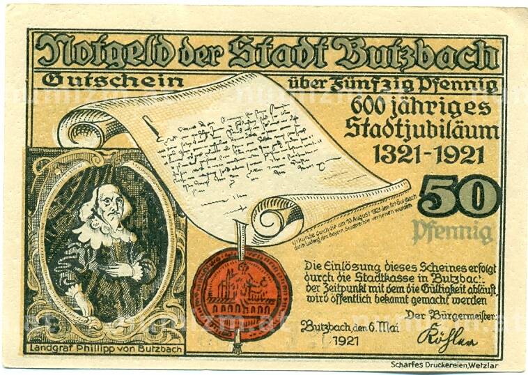 20.01.2025Интернет магазин «Нумизмат» предлагает приобрести 50 пфеннигов 1921 года Германия — Буцбах (Нотгельд).