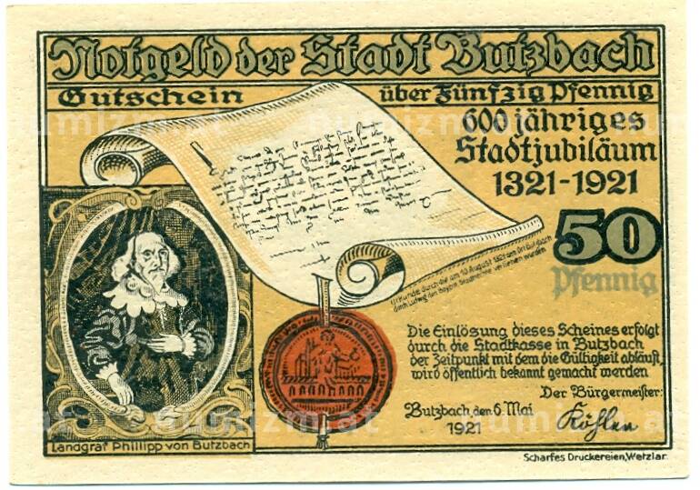 Банкнота 50 пфеннигов 1921 года Германия — Буцбах (Нотгельд) (Артикул: K10-12037): подробные характеристики, качественные фотографии в высоком разрешении, низкая цена.