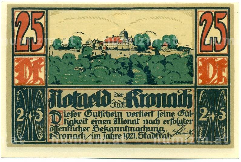 Банкнота 25 пфеннигов 1921 года Германия — Кронах (Нотгельд) (Артикул: K10-12143): подробные характеристики, качественные фотографии в высоком разрешении, низкая цена.