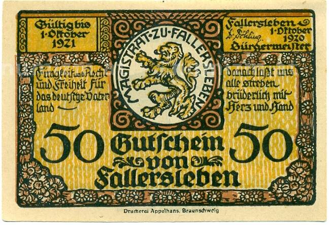 Купить 50 пфеннигов 1920 года Германия — Фаллерслебен (Нотгельд) по привлекательной цене можно в нашем интернет-магазине — Вам достаточно оформить заказ на сайте. Все монеты, представленные в каталоге, находятся в наличии на нашем складе.
