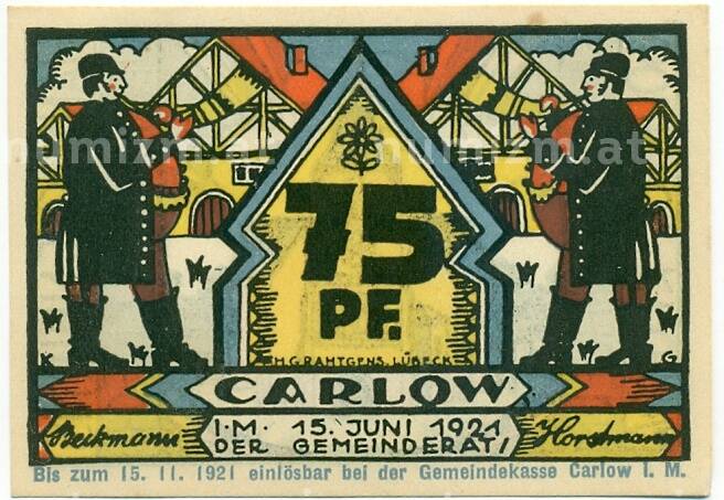 Банкнота 75 пфеннигов 1921 года Германия — Карлоу (Нотгельд) (Артикул: K10-12165): подробные характеристики, качественные фотографии в высоком разрешении, низкая цена.