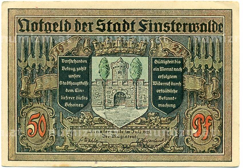 Банкнота 50 пфеннигов 1921 года Германия — Финстервальде (Нотгельд) (Артикул: K10-12178): подробные характеристики, качественные фотографии в высоком разрешении, низкая цена.