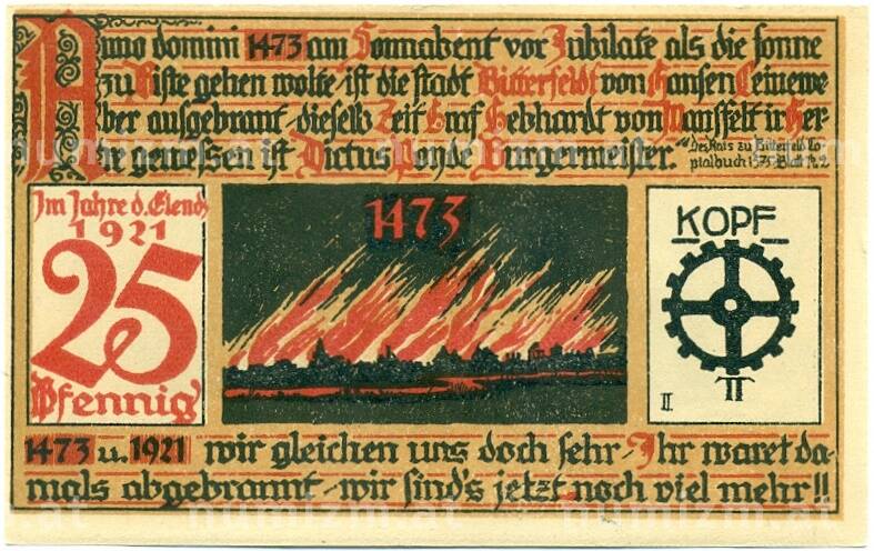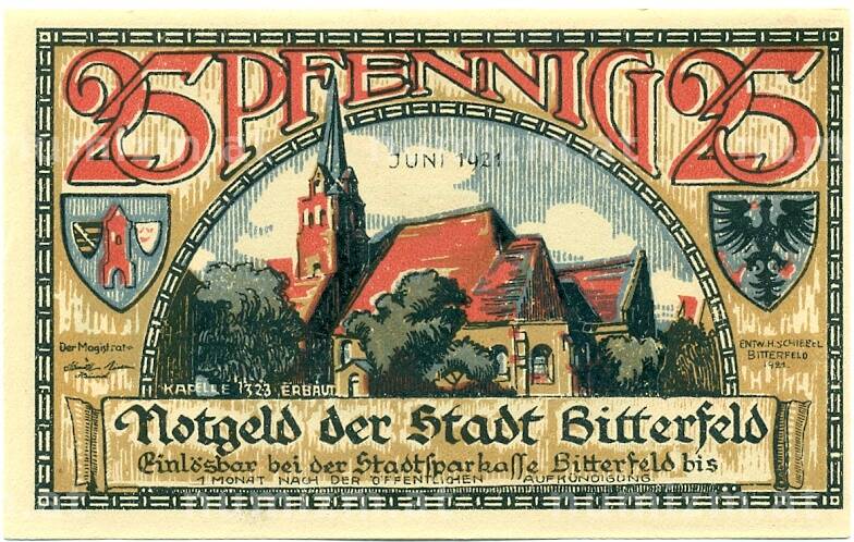 Банкнота 25 пфеннигов 1921 года Германия — Биттерфельд (Нотгельд) (Артикул: K10-12187): подробные характеристики, качественные фотографии в высоком разрешении, низкая цена.