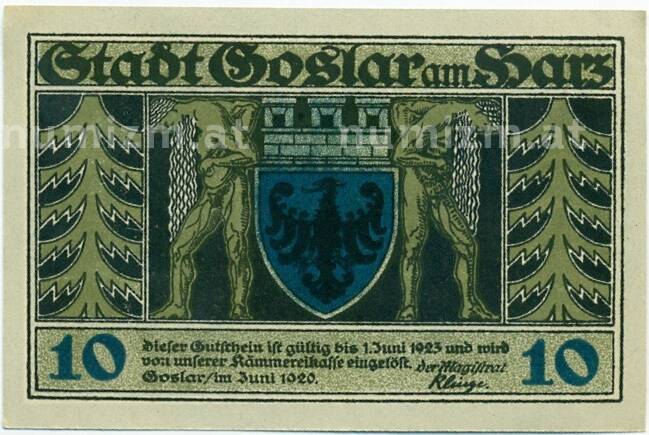 Банкнота 10 пфеннигов 1920 года Германия — Гослар (Нотгельд) (Артикул: K10-12191): подробные характеристики, качественные фотографии в высоком разрешении, низкая цена.
