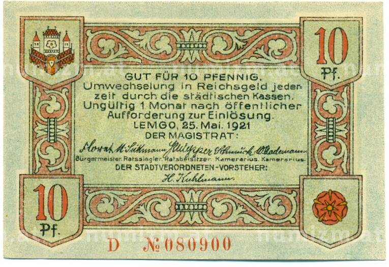 Купить 10 пфеннигов 1921 года Германия — Лемго (Нотгельд) по привлекательной цене можно в нашем интернет-магазине — Вам достаточно оформить заказ на сайте. Все монеты, представленные в каталоге, находятся в наличии на нашем складе.