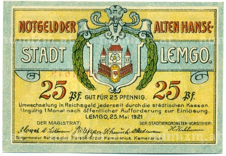 Купить 25 пфеннигов 1921 года Германия — Лемго (Нотгельд) по привлекательной цене можно в нашем интернет-магазине — Вам достаточно оформить заказ на сайте. Все монеты, представленные в каталоге, находятся в наличии на нашем складе.