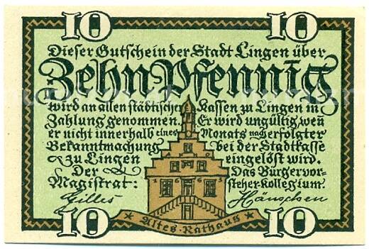 Купить 10 пфеннигов 1921 года Германия — Линген (Нотгельд) по привлекательной цене можно в нашем интернет-магазине — Вам достаточно оформить заказ на сайте. Все монеты, представленные в каталоге, находятся в наличии на нашем складе.
