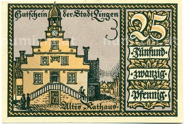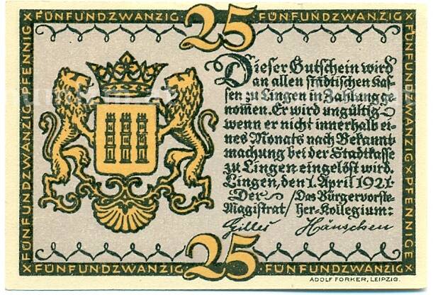 Купить 25 пфеннигов 1921 года Германия — Линген (Нотгельд) по привлекательной цене можно в нашем интернет-магазине — Вам достаточно оформить заказ на сайте. Все монеты, представленные в каталоге, находятся в наличии на нашем складе.