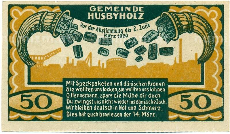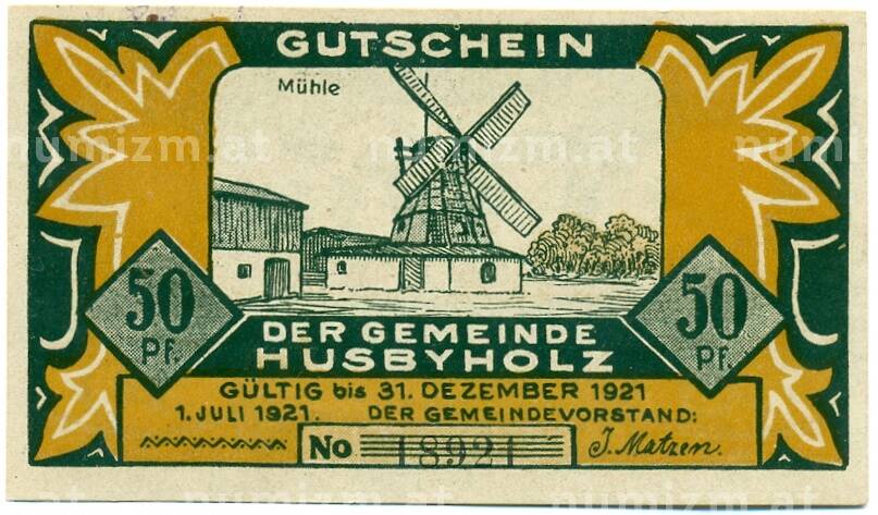 Банкнота 50 пфеннигов 1921 года Германия — Хусбихольц (Нотгельд) (Артикул: K10-12227): подробные характеристики, качественные фотографии в высоком разрешении, низкая цена.