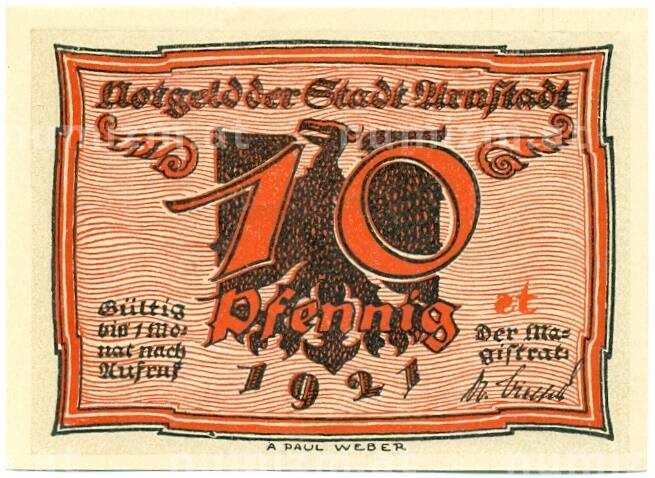 Банкнота 10 пфеннигов 1921 года Германия — Арнштадт (Нотгельд) (Артикул: K10-12233): подробные характеристики, качественные фотографии в высоком разрешении, низкая цена.