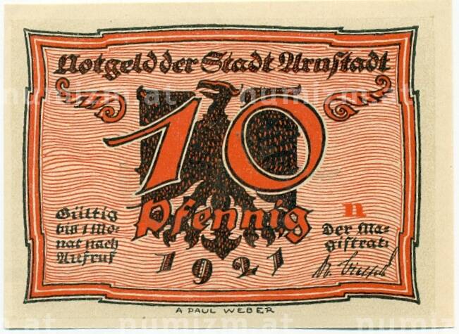 Банкнота 10 пфеннигов 1921 года Германия — Арнштадт (Нотгельд) (Артикул: K10-12234): подробные характеристики, качественные фотографии в высоком разрешении, низкая цена.