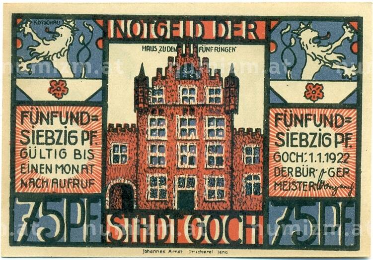 Купить 75 пфеннигов 1922 года Германия — Гох (Нотгельд) по привлекательной цене можно в нашем интернет-магазине — Вам достаточно оформить заказ на сайте. Все монеты, представленные в каталоге, находятся в наличии на нашем складе.
