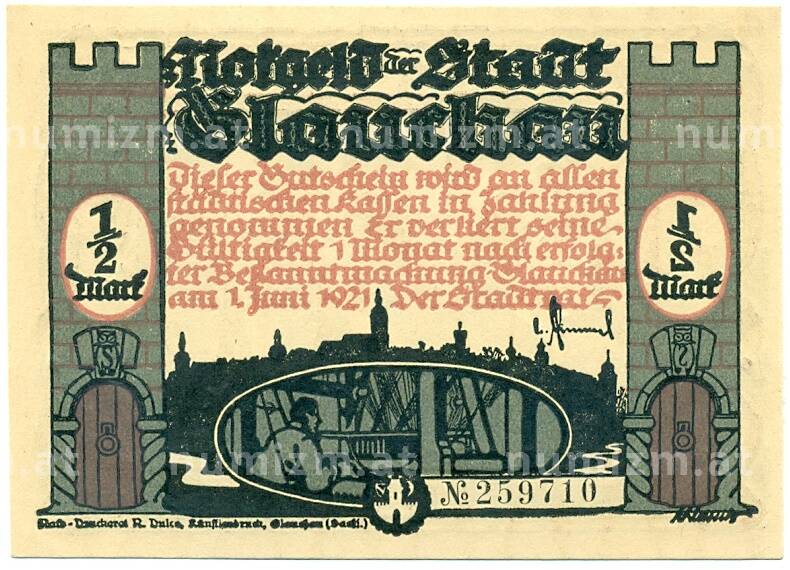 Банкнота 1/2 марки 1921 года Германия — Глаухау (Нотгельд) (Артикул: K10-12251): подробные характеристики, качественные фотографии в высоком разрешении, низкая цена.