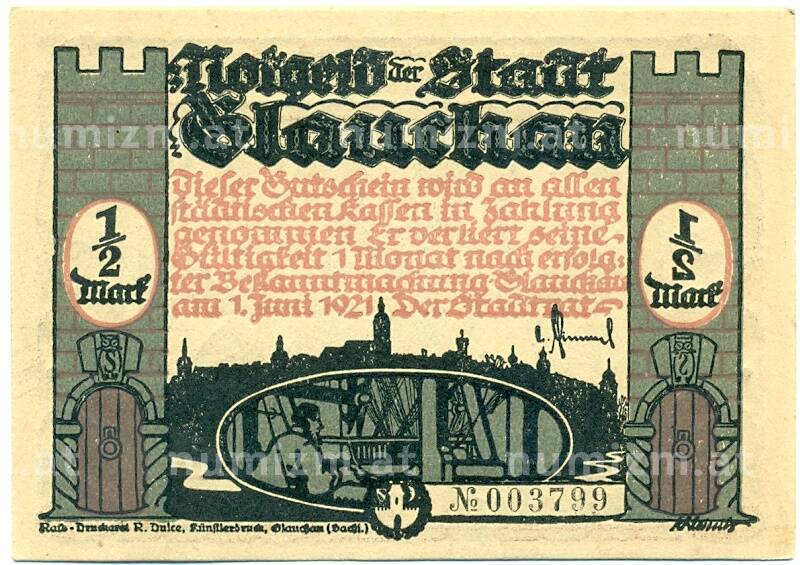 Банкнота 1/2 марки 1921 года Германия — Глаухау (Нотгельд) (Артикул: K10-12252): подробные характеристики, качественные фотографии в высоком разрешении, низкая цена.